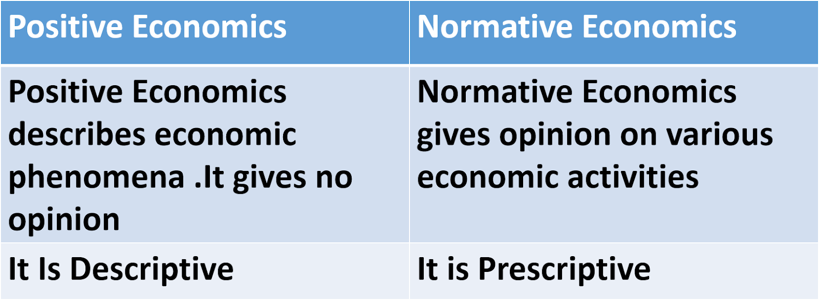 Positive Economics describes economic phenomena .It gives no opinion and Normative Economics gives opinion on various economic activities . Positive Economics Is Descriptive and Normative Economics is Prescriptive.